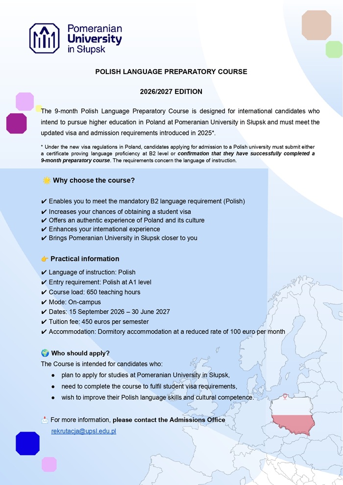 Potwierdzenie znajomości języka polskiego na poziomie B2 uprawnia do podjęcia studiów na naszej uczelni.