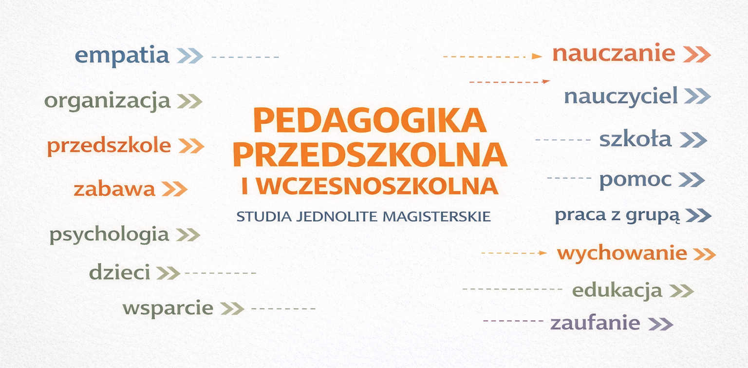 Pedagogika przedszkolna i wczesnoszkolna – przygotowuje do pracy w zawodzie nauczyciela wychowania przedszkolnego oraz nauczyciela edukacji wczesnoszkolnej (klasy I–III). Studia rozwijają kompetencje wspierania rozwoju dziecka, organizowania procesu uczenia się oraz diagnozowania potrzeb edukacyjnych i rozwojowych dzieci. W trakcie studiów zdobędziesz także przygotowanie do nauczania języka angielskiego w przedszkolu oraz w klasach I–III szkoły podstawowej. Kierunek rozwija kompetencje organizacyjne umożliwiające w przyszłości prowadzenie własnej placówki edukacyjnej, np. przedszkola lub punktu przedszkolnego.