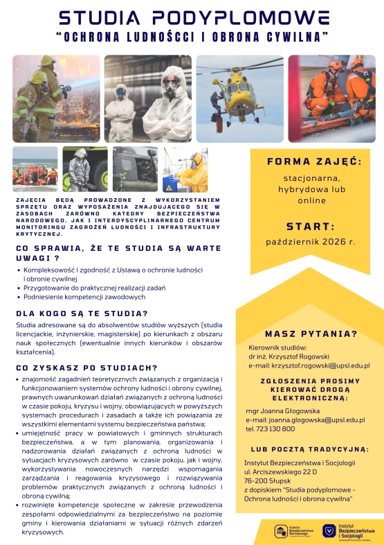 Program studiów ukierunkowany jest na zagadnienia związane z ochroną ludności i obroną cywilną (Ustawa z dnia 5 grudnia 2024 r. o ochronie ludności i obronie cywilnej), to odpowiedź na rosnące wymagania stawiane pracownikom administracji publicznej. Współczesne realia – zarówno legislacyjne, jak i praktyczne – wymagają od pracowników nie tylko gruntownej wiedzy w zakresie obowiązujących przepisów, ale także umiejętności reagowania na sytuacje kryzysowe i zagrożenia obywateli.
